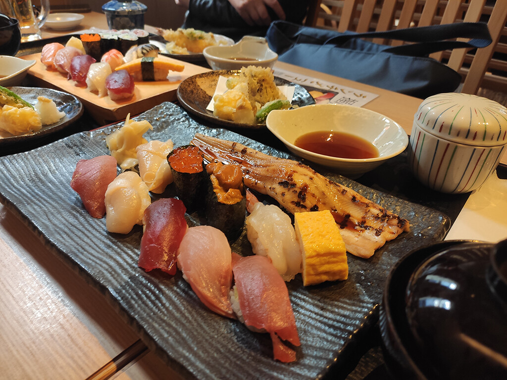 Еда в Японии мне тоже понравилась. Вообще я консервативен в плане еды, но японскую кухню оценил. Особенно сильно мне понравились суп рамен, суши Fatty Salmon (я их прям распробовал, будут теперь пытаться их найти в России), онигири. Сябу-сябу тоже оказалось вкусным опытом, мяса съел больше, чем было необходимо организму, просто из-за вкуса. Впервые попробовал маття, чай специфичный, но всё равно вкусный. Во второй раз, когда сходили на чайную церемонию, ещё и аутентично было.